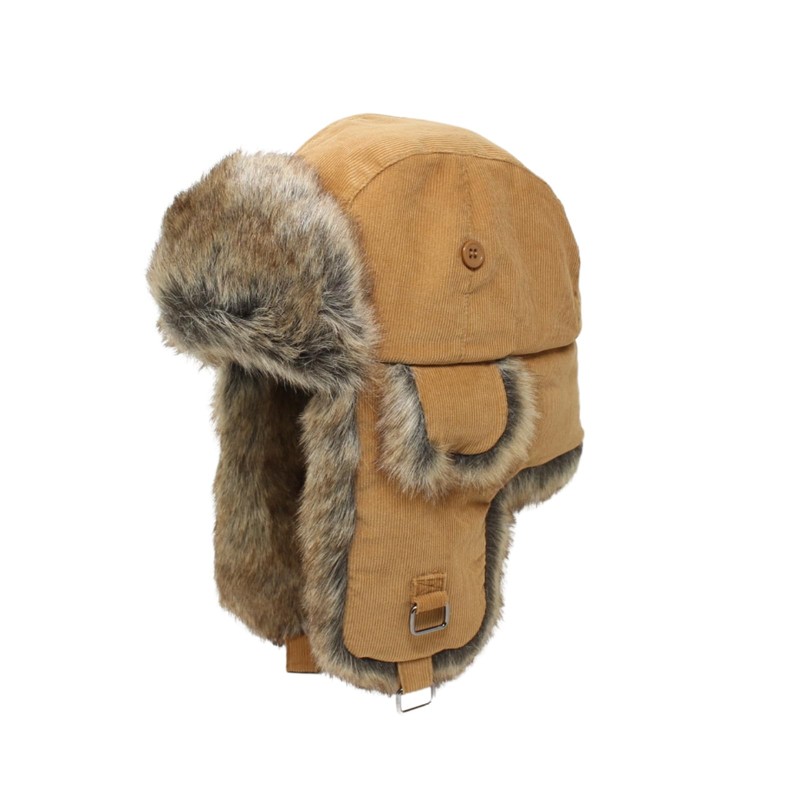 Corduroy Flight Cap Made of rich faux fur with voluminous filling for extra warmth Enjoy 2 ways to wear the flap up or down with the adjuster. It is popular for skiing, snowboarding, and is also popular for wearing around town.