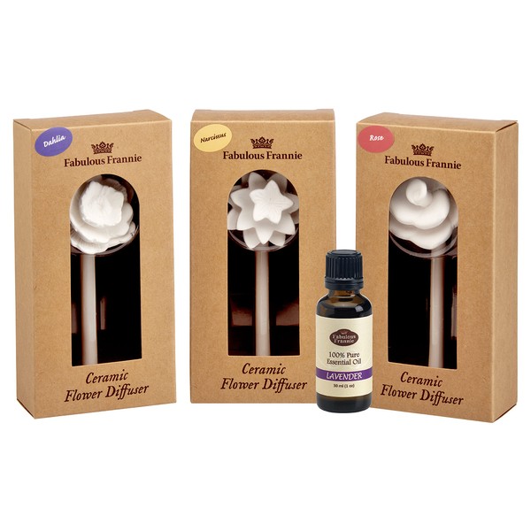 Fabulous Frannie Lavender Aromatherapy Ceramic Flower Diffuser with 30ml 100% Pure Essential Oil 3pk Set.