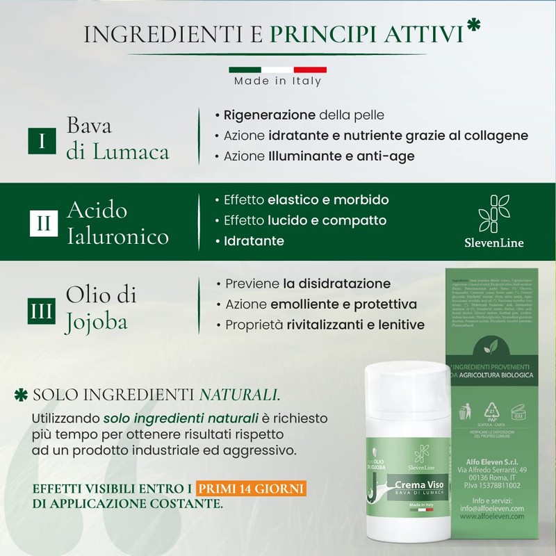 - Made in Italy – The anti-wrinkle face cream from SlevenLine is completely formulated and manufactured in Italy with organic and natural ingredients. The formulation has been studied by dermatologists and ophthalmologists to give the skin a radiant and soothing effect.