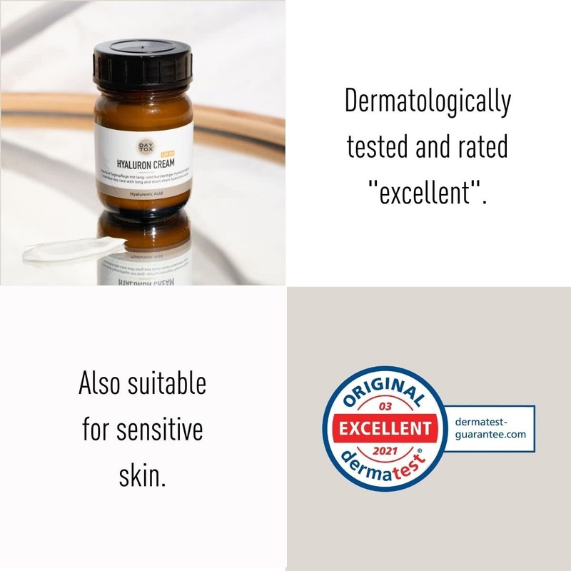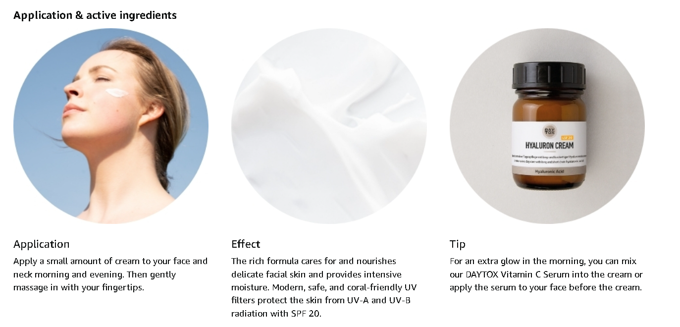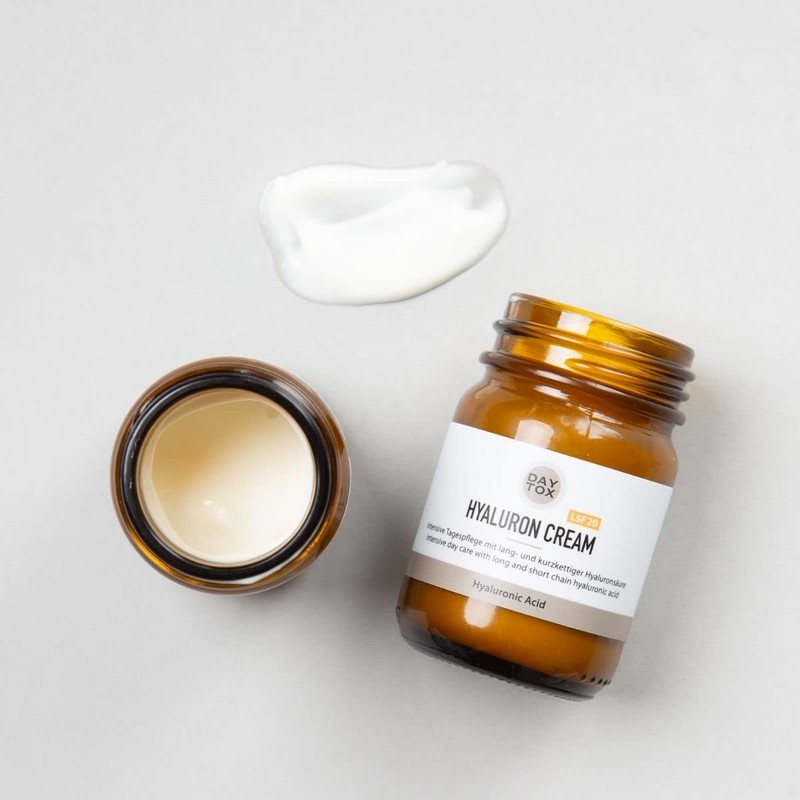 DAYTOX Hyaluron Cream SPF 20 – Gentle, dermatologically tested face cream with long- and short-chain hyaluronic acid for deep hydration and visibly firmer, plumper skin. Provides daily UVA/UVB protection without octocrylene to prevent premature aging. Enriched with antioxidants like aloe vera, broccoli, and citrus extract for a fresh, radiant complexion. Suitable for all skin types. Use daily; mix with vitamin C serum for an extra glow.