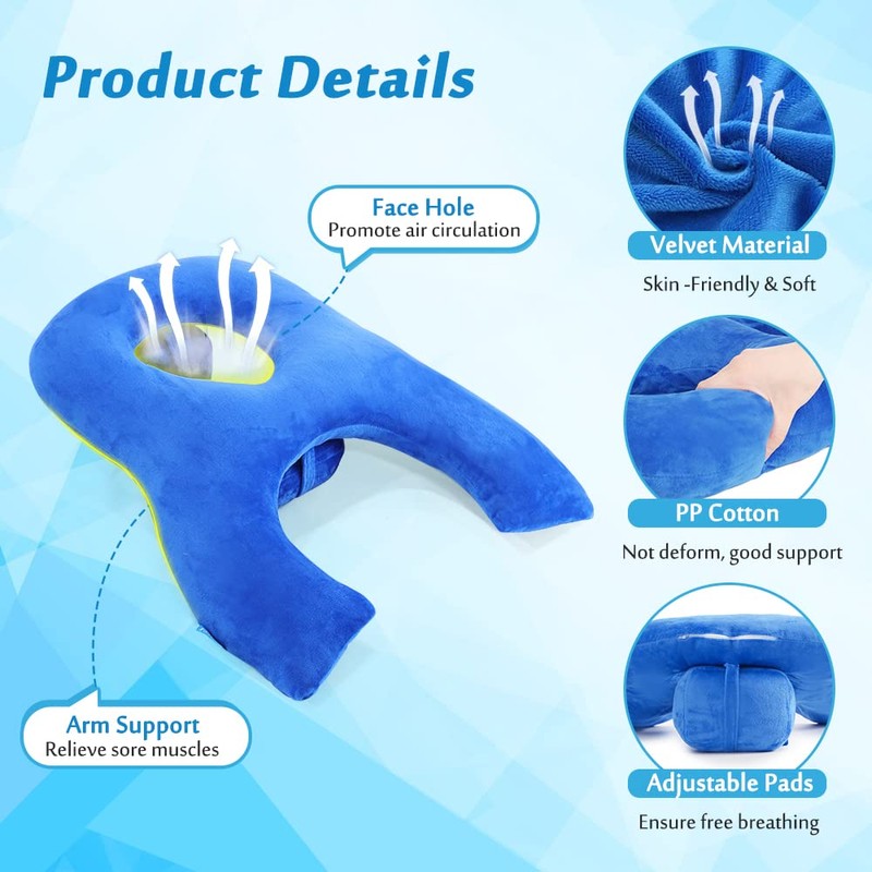 - đ ăPillow with Face Holeă7.5 by 6 inch face hole provides more space, and promotes air circulation. Arm design can support the neck and arm, relieve muscle soreness and improve sleep quality.