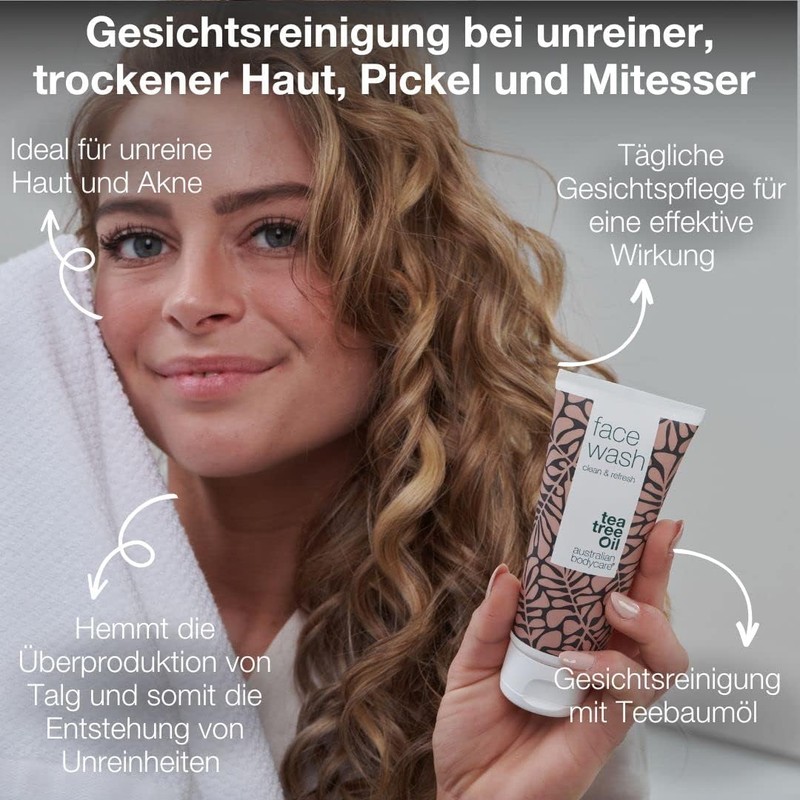 - 🌿 PRODUCT INFO: What's in the product? Our face wash gel Face Wash contains 100% natural Australian tea tree oil. The unique composition of natural ingredients moisturises the skin and helps with pimples and other blemishes. All Australian Bodycare products are dermatologically tested and 100% vegan.