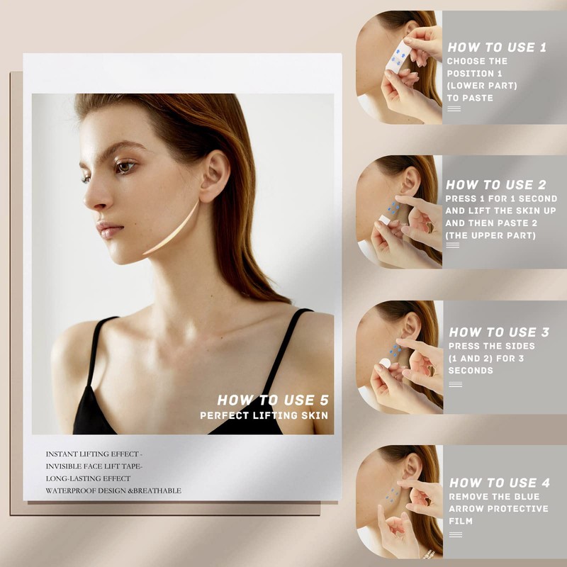 - [Easy to Use] Please make sure there is no makeup or oil on your face before use. Simply put one end of the tape on our face, lift our skin to the right position, then put the other end on our skin and hold it for 3-5 seconds to fix it, the effect immediately, it can cover up the fat on your face in just one minute. Effectively relieving conditions such as sagging skin or baby fat and double chin, visually refining the facial contours and making your skin look tighter and younger.