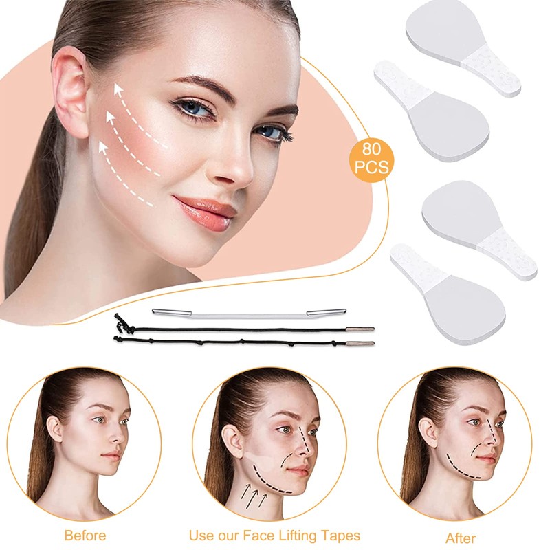 - Package includes: 80 face lifting tape, 3 pull cords and 1 facelift tape bands. The face lifting tape is made of environmentally friendly materials that are safe, healthy, soft and comfortable to use. Face lifting tape improves face and neck. The lifting system improves sagging skin as well as wrinkles on the face, neck and eye area. The face lifting tape is waterproof, has good elasticity, does not feel tight on the face and creates a V-shaped face.