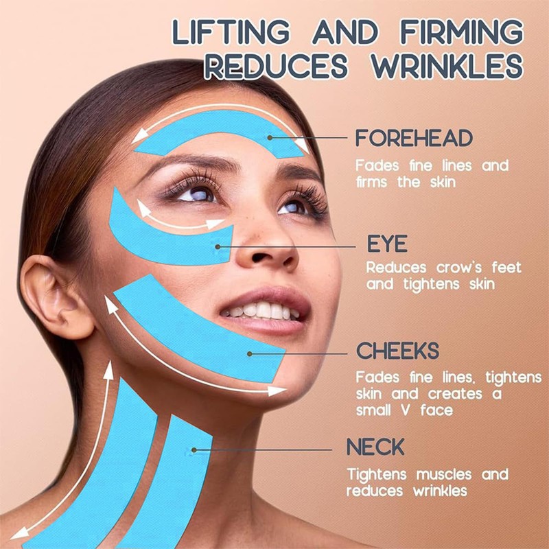 - Face contour sharpening: this face lifting tape not only prevents nasolabial wrinkles, but also promotes lymphatic outflow, reduces swelling and shapes the cheekbones. Simply start at the cheek area and pull towards the ears.