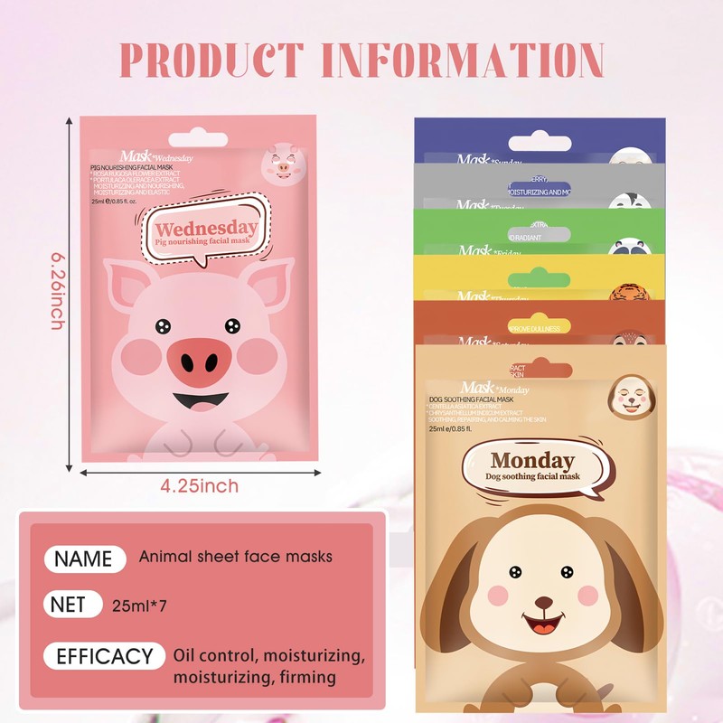 - Cute Patterns Each face mask for women is designed with cute animal patterns, namely lamb, deer, panda, tiger, piglet, zebra, puppy. The selected moisturising and moisturising ingredients and cute animal patterns make the mask full of energy