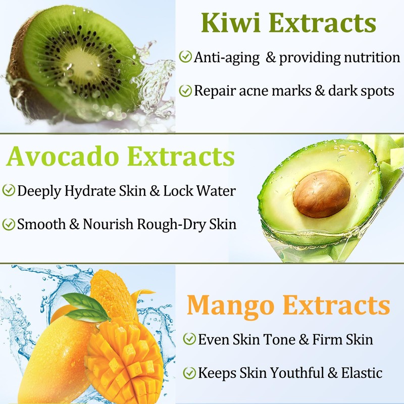 - 🌸【6PCS Natural Fruit Mask Set】 Our fruit face masks skincare set contain natural plant ingredients: Mango, Kiwi and Avocado,which are mild and do not irritate the skin, effectively replenish moisture, and are suitable for all skin types. Note: All our products are vegan without abuse.