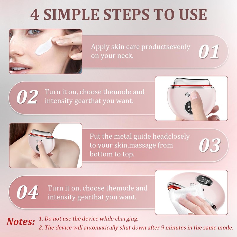 - Smart Auto Shut-Off & Safe Heating: Designed for convenience and safety, this microcurrent skin firming device automatically shuts off after 9 minutes in the same mode to prevent overuse. Simply restart it to continue your session. Its built-in heat therapy (38°C-46°C) helps calm and relax the skin, while improving the absorption of serums or firming creams. Overheat protection brings a comfortable and worry-free experience.