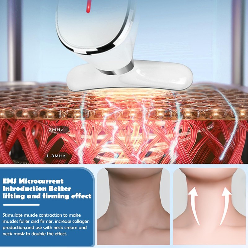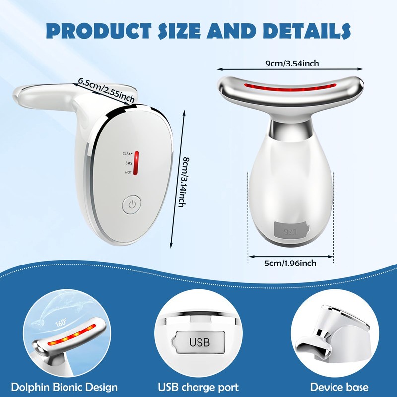 - Massager EMS face: micro-current multifunctional face massager intelligent temperature control technology face lifting device can provide comfortable, constant 38~42°C hot compress, open skin pores and promote the absorption of skin care products. Hot compresses with light therapy rods can also relax the neck skin, relieve skin discomfort.
