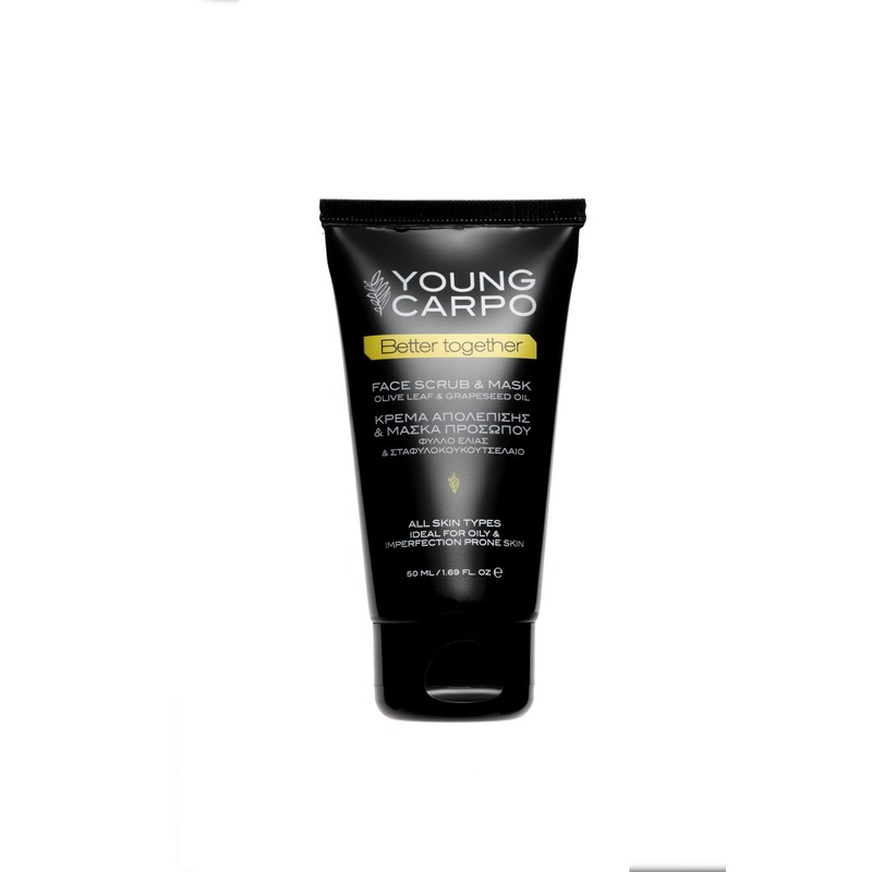 YOUNG CARPO’s ‘Better Together’ 2-in-1 Face Scrub & Mask cleanses, exfoliates, and detoxifies. Formulated with perlite, a natural volcanic rock exfoliant, which gently removes dead skin cells and stimulates cell renewal. Blended with organically cultivated olive leaf extract, a skincare superfood laden with antioxidant, anti-inflammatory and antibacterial properties, and vitamin E for skin conditioning and softening, this scrub & mask combo leaves the skin feeling smooth, soft, and refreshed. Finally, aloe vera and non-comedogenic grape seed oil provide hydration and nourishment to even the most sensitive skin. Dermatologist-approved, suitable for all skin types, and ideal for oil & blemish-prone skin.