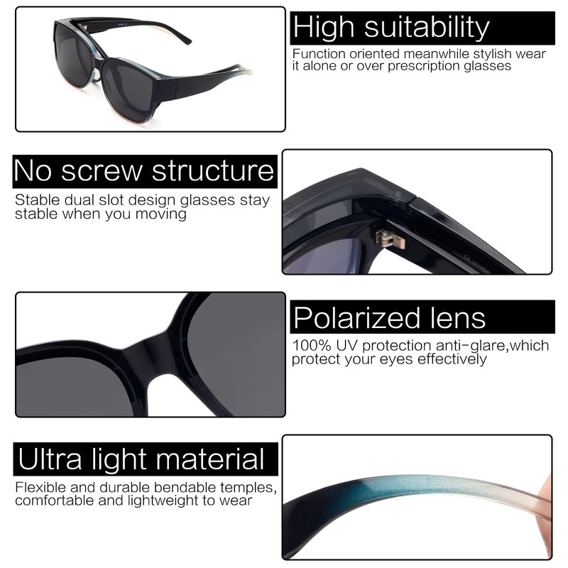 • Ultralight and comfortable: the material of the frame is lightweight and flexible, very comfortable to wear. The slip-on sunglasses for men and women are ultra-light and hardly burden you when you wear the sunglasses over normal glasses.