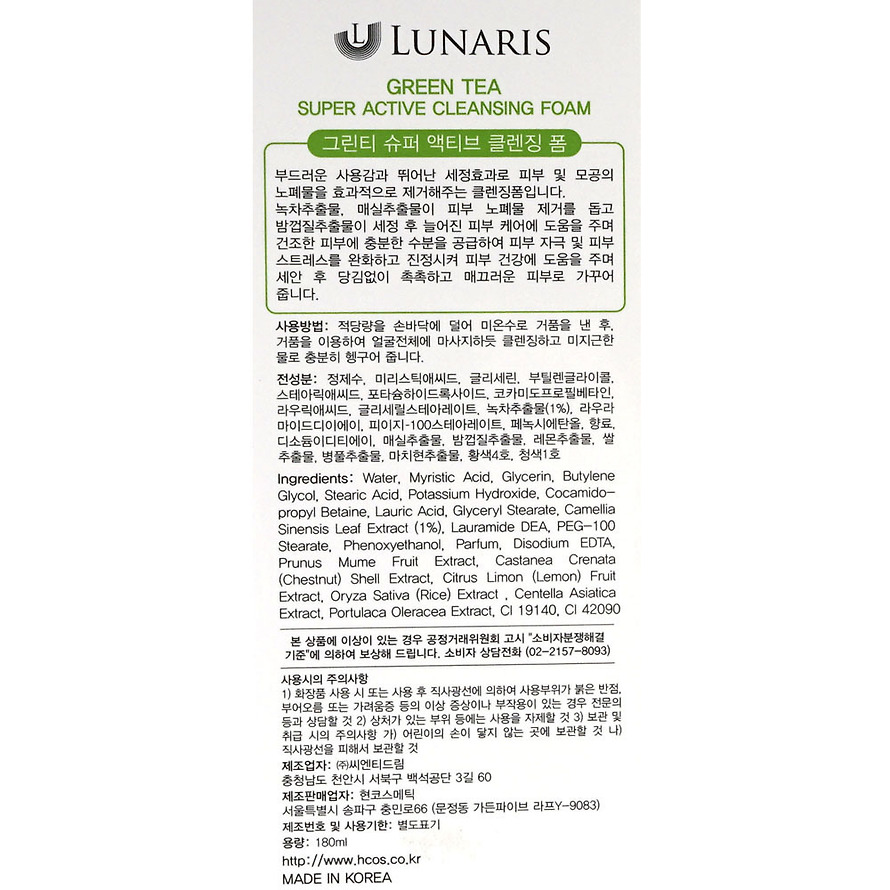 Face Wash Lunaris Green Tea Cleansing Foam 180ml / 얼굴 세안 루나리스 그린티 클렌징 폼 180ml