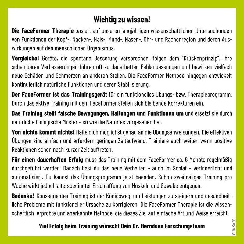 • DR. BERNDSEN FACEFORMER is an approved medical device made in Germany. The FaceFormer is used as a training device in the cause-oriented therapy of numerous health impairments. The simple exercises with the FaceFormer often lead to first success after just a few days of use.