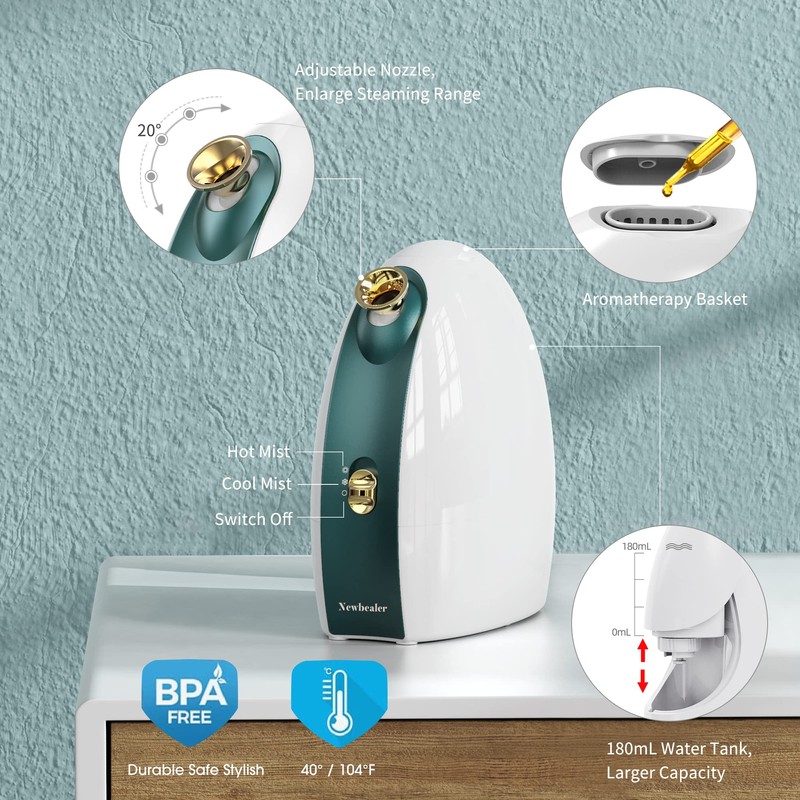 - [Safe Material and Design for At-Home Spa] The Newbealer facial steamer is made up of ecofriendly ABS and non-irritating BPA-free material making it a good choice for home or business for safer spa experience. The steamer is crafted to fit your modern requirements with its light weight of 2.7lbs, slim design that makes it portable and water tank capacity of 180ml.