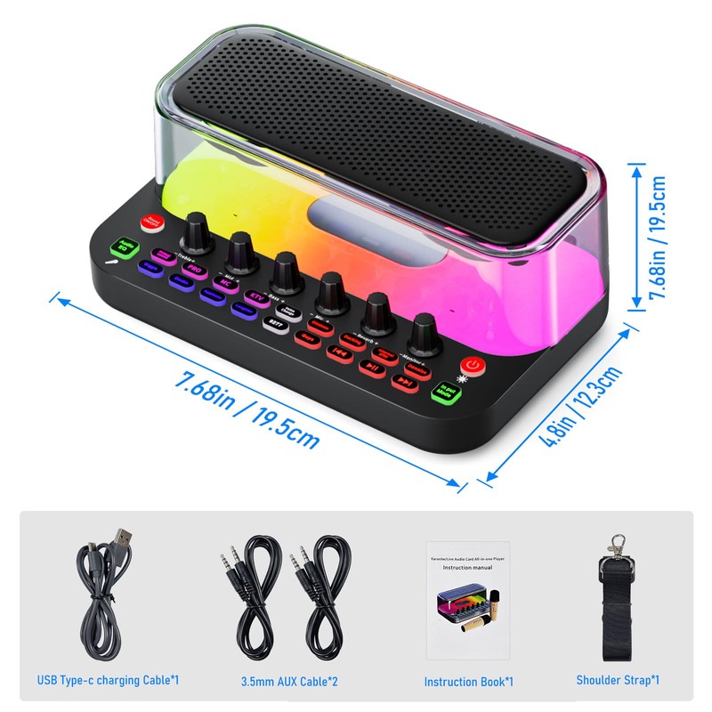- 【Package Included】-- 1 x Live Sound Card Audio Karaoke Machine, 2 x Wireless Condenser Microphones, 1 x Type-C Data Cable,2 x 3.5mm audio cable, 1 x Detachable Shoulder Strap (for Carrying), 1 x User Manual. The design of the soundcard sound and button panel makes it simple and easy to use, ideal for beginners or intermediate podcasters
