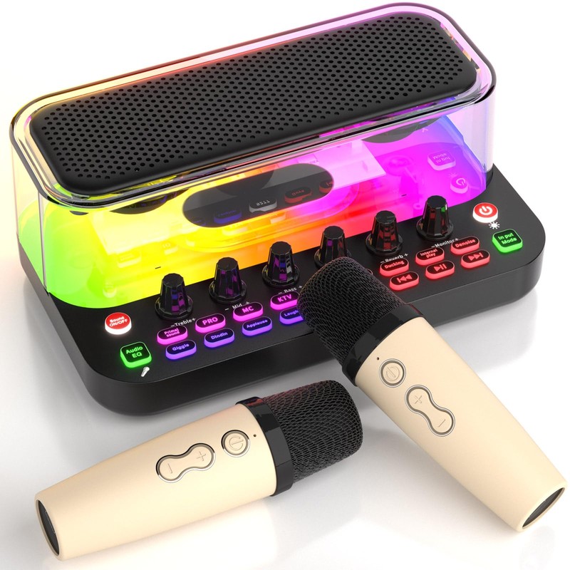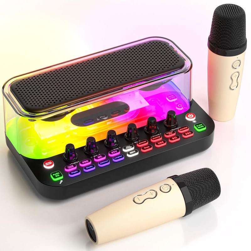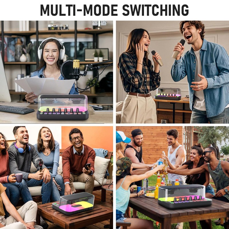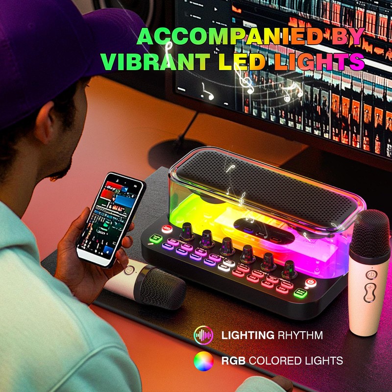 - 【Dynamic Lighting & Sound Effects】-- The Soundcard Karaoke system features 6 warm-up sound effects and 4 voice changes (female, male, baby, monster) and vibrant LED ambient lights, you can switch between the light modes easily at a touch of a button, and effortlessly surprise and create a karaoke atmosphere for your karaoke parties and live broadcasts, so you can immerse yourself into the lively party atmosphere