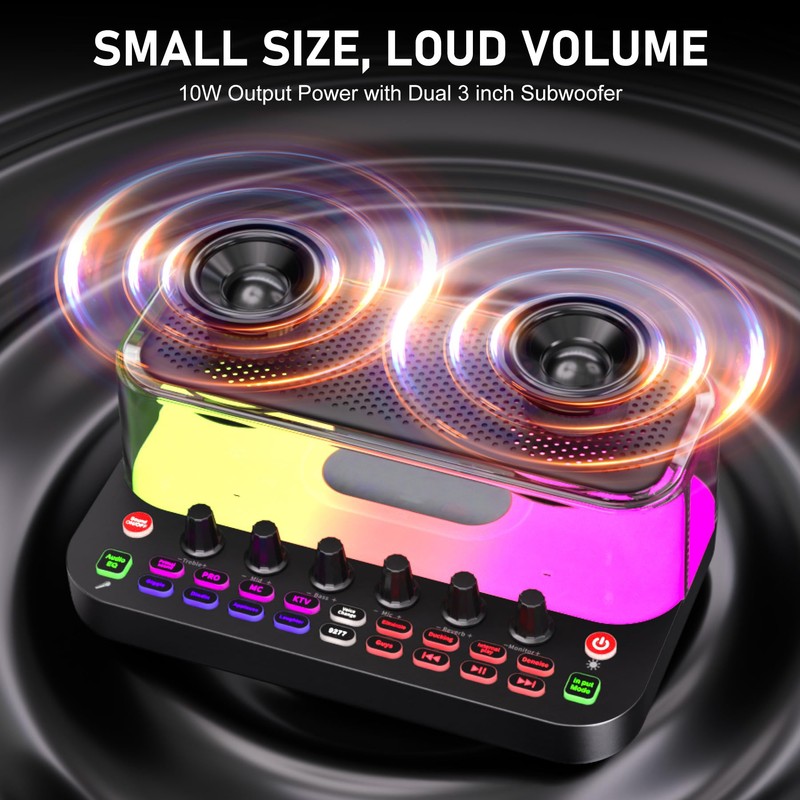 - 【All-in-one Karaoke Machine & Live Sound Card】-- Our sound card speaker systems not only support Bluetooth mode, accompaniment mode, but also offer a variety of connectivity options for live streaming, home karaoke and Bluetooth stereos. Connect directly to your phone and computer via OTG cable to play songs for streaming, or use BT to connect to your TV and use the included mics or connect a condenser mic with a 3.5mm jack to host a karaoke party at home and start a rich musical journey