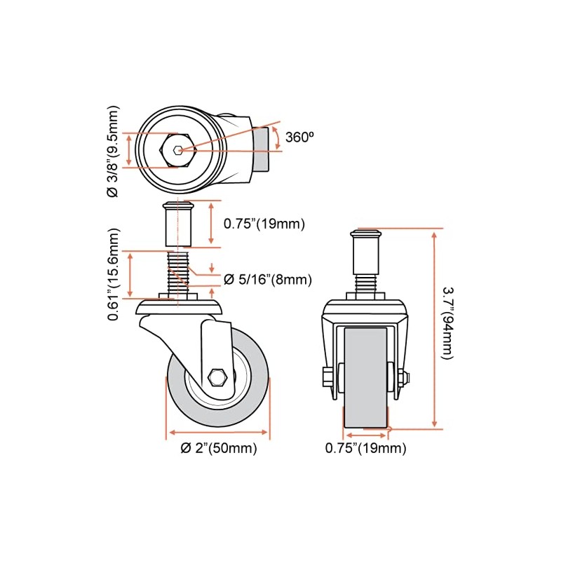 - INSTANT MOBILITY: 2" diameter x 3/4" width wheel; 3.7" overall height; smooth, quiet and non-marking polyurethane wheels. Threaded-post mount, 3/8" X 5/16" with square base; flush cap, washer/lock-washer included.