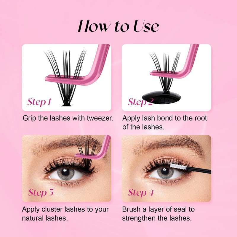 - How to Use: The lash kit is super easy to use. Grip the lashes with cluster lash tweezers. Apply cluster lash bond to the root of the volume cluster lashes or gently brush your natural eyelashes with the lash bond. After wearing it to the base of your lash, gently brush a layer of seal to strengthen the individual eyelashes. Done. Even if you're a beginner, you can do it easily.