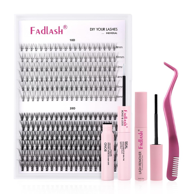 FADLAHS DIY Lash Extensions Kit, 10D+20D 0.07 D Curl Lash Clusters Individual, Bond and Seal, Remover and Tweezers for Beginners (10D+20D, 8-16mm)