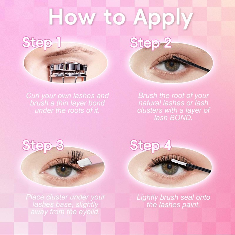 - 【How to use the lash extension kit】:Curl your lashes with an eyelash curler. Apply volume cluster lash extension glue to the roots of your volume cluster lashes or lightly brush your natural lashes with a lash bond. As the final step, apply an appropriate amount of sealing liquid to the root of the eyelashes for a long-lasting effect.