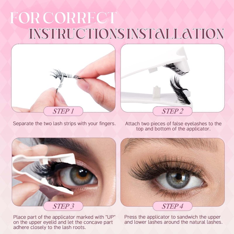 - 𝐇𝐨𝐰 𝐓𝐨 𝐔𝐬𝐞: Gently separate the two pieces of eyelashes,Align the lashes on the UP and DOWN sides of the lash applica tool,then, Keep the lash applicator as close to the root of your own lashes as possible. And keep the UP applicator still, then gently close the Down clip.