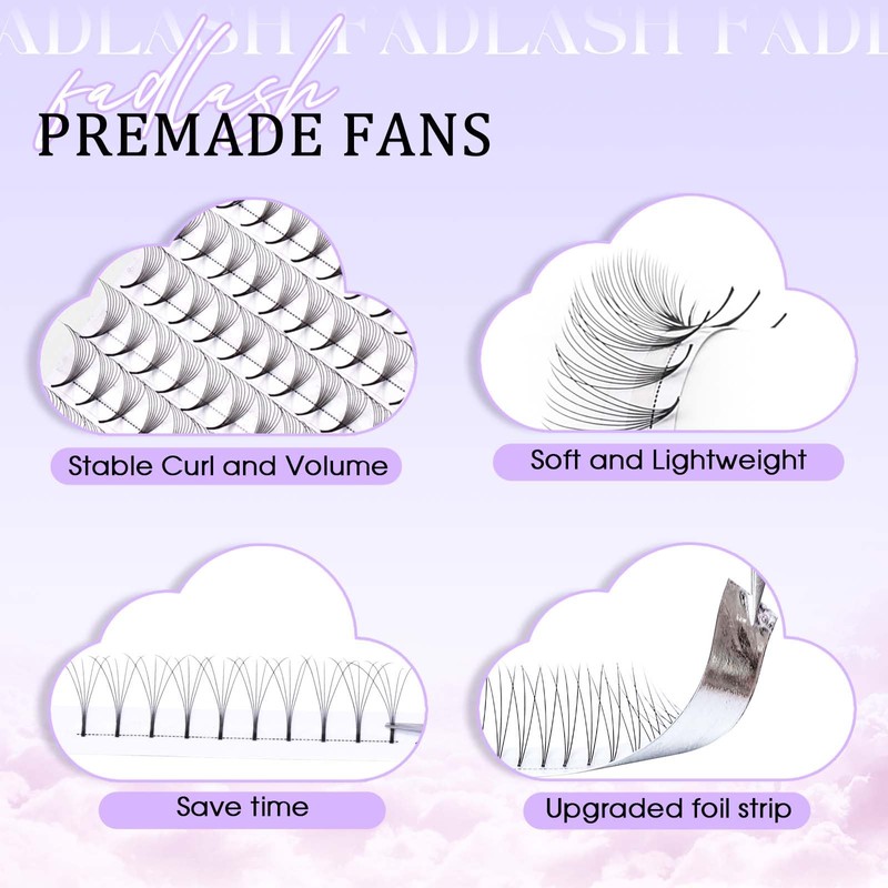 - đăUpgrade Premade Lash FansăThese premade fans eyelash extensions ensure long-lasting durability. Elevate your beauty routine with lashes that maintain their pristine condition, offering a long-lasting glamorous touch.