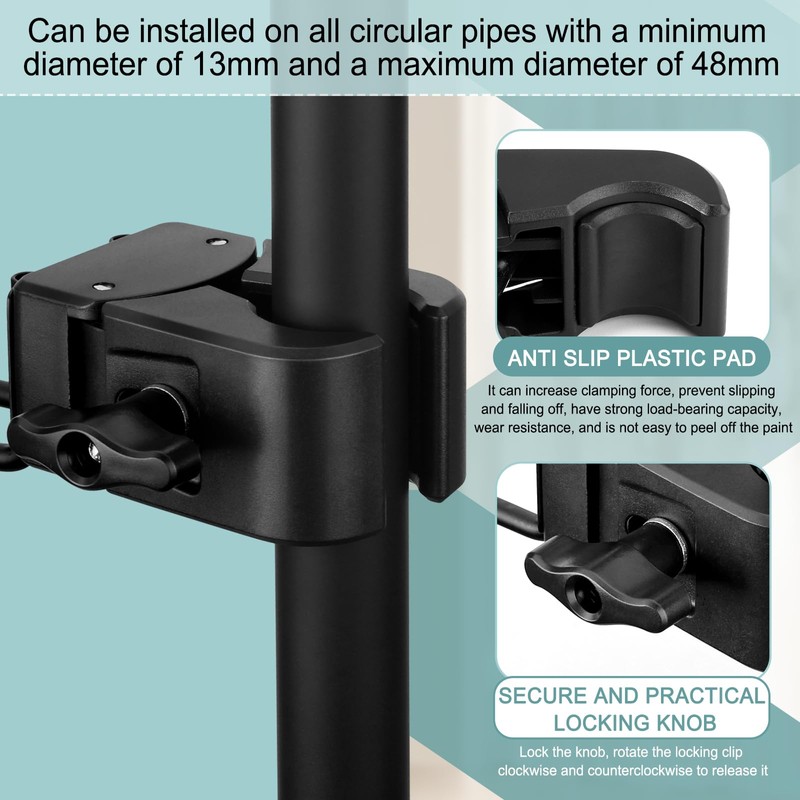 • **2. Installation Specs**: The drink holder can be mounted on vertical round poles with a diameter between 13mm to 48mm. Compatible with floor phone stands, tablet stands, balcony railings, umbrella poles, and round table or chair legs.