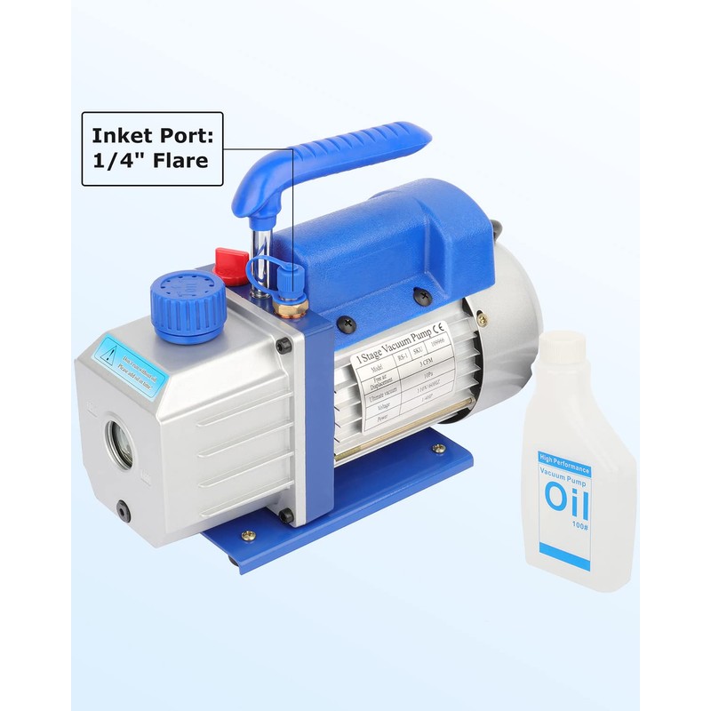 - Anti-returning Oil Design: The inlet channel is specially designed to prevent the pump oil from flowing back and polluting the pumped container and pipeline after stopping the pump,With 1/4"Inlet Port, the maximum capacity of the pump is 225ML, and we will offer a bottle of 200ml vacuum pump oil as a test.