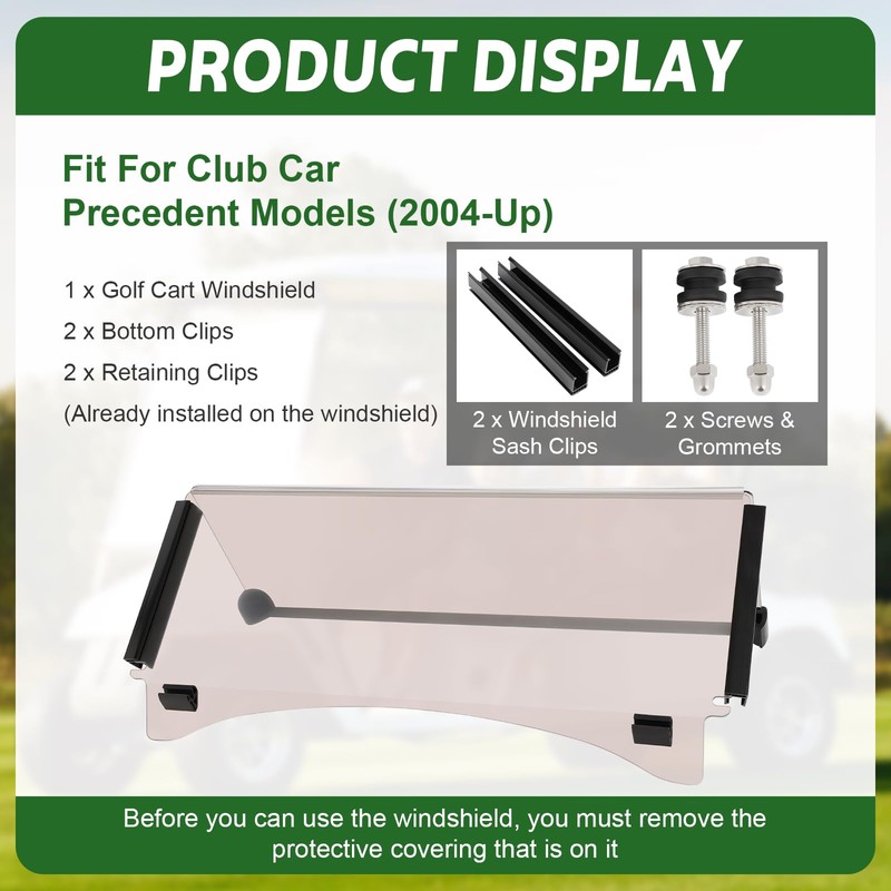 • COMPATIBLE MODELS: This windshield is specifically designed for club car precedent golf carts manufactured after 2004, suitable for both gasoline and electric models. It is intended for use with carts that have the original glass and is not compatible with modified carts. Please verify your golf cart's model before purchasing.