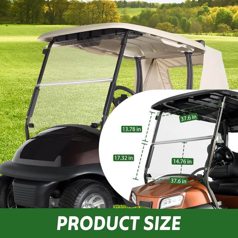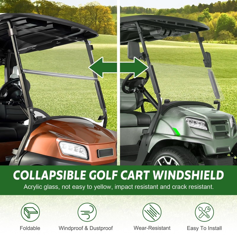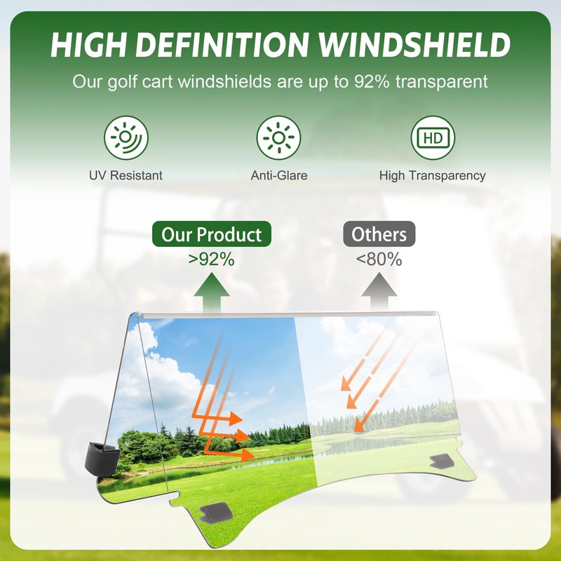 • PREMIUM MATERIAL: The golf cart windshield is crafted from high-quality acrylic glass material, which does not yellow over time and is both sturdy and durable. Golf cart windshield features UV resistance, shatterproof, impact-resistant, and crack-resistant properties, providing you with ample protection throughout the year.