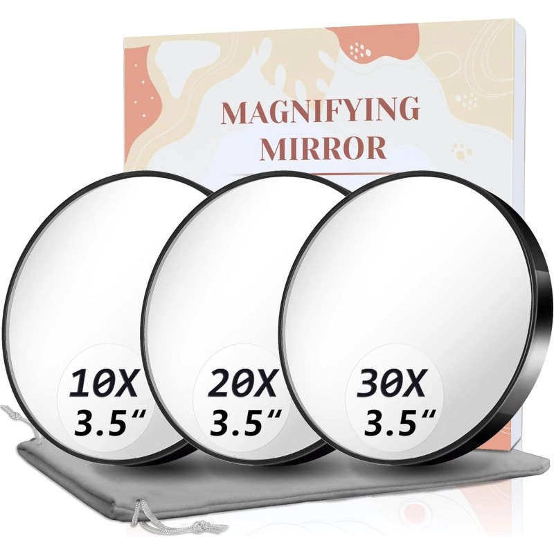 - Three Mirrors for the Price of One: Magnifying Mirror with 10x & 20x & 30x set for every need. 10x for contact lenses & makeup touch-ups, 20x for eyebrow plucking and removing white hairs on the face, and 30x for removing blemishes and blackheads, each magnifying mirror makes the best use of everything