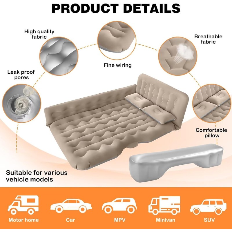 • 【All Products You Will Get】① Multifunctional air mattress ② Two inflatable pillows car inflatable bed ③ Car air pump ④ Instruction manual ⑤ Tote bag.Each product will undergo strict testing and quality control, so you can use the car air mattress camping bed with confidence.