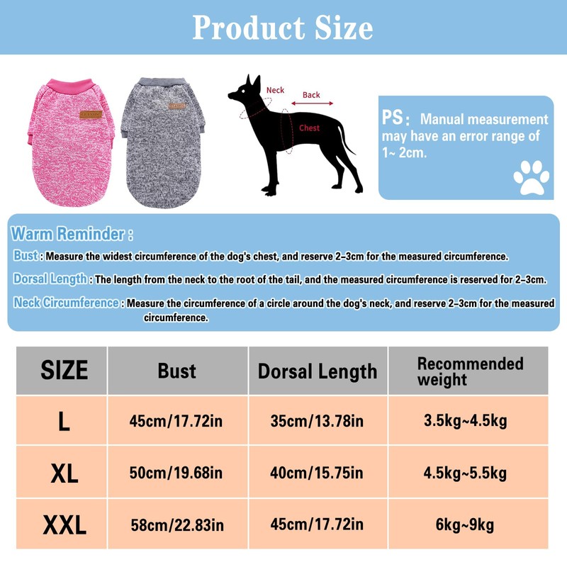- Friendly tips: Please measure your pet's body type before purchasing: neck circumference, chest circumference, back length, weight and choose the right size of the sweater for dogs according to our size chart