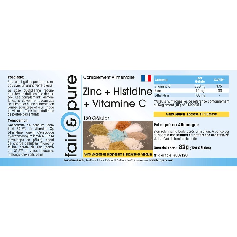 - For your health: zinc + histidine + vitamin C, vegan, 120 capsules – the product is gluten-free, fructose-free and lactose-free as well as free from magnesium stearate, silicon dioxide, colours, flavours and preservatives