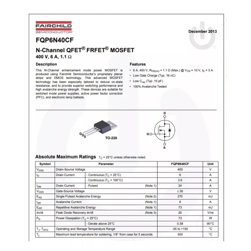 Introducing the Fairchild FQP6N40CF N-Channel MOSFET, the perfect component for electronic circuitry. This tube of 50 comes with free shipping and boasts impressive specifications including a maximum collector-base voltage of 400V, maximum power dissipation of 73W, and a minimum operating temperature of -55 °C (-67 °F).
