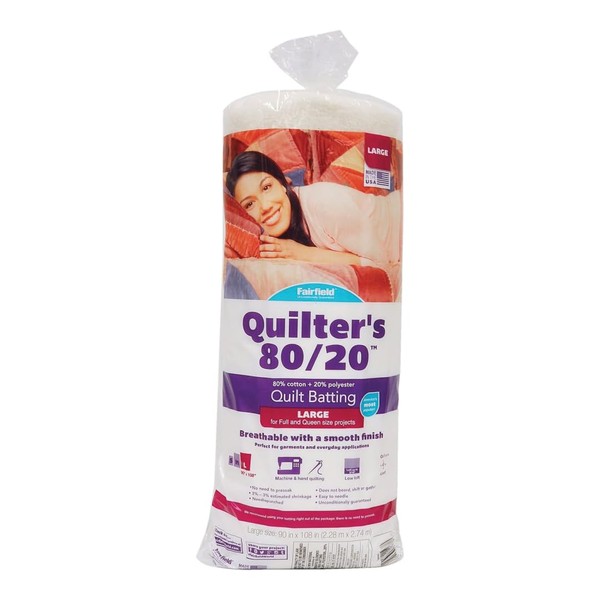 Fairfield Quilter’s 80/20 Quilt Batting, Premium Cotton and Polyester Batting for Quilting, Ideal for Clothing, Crafts, Wall Hangings, and Quilts, Quilting Supplies, 90" x 108"