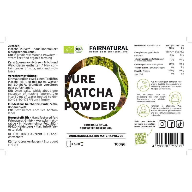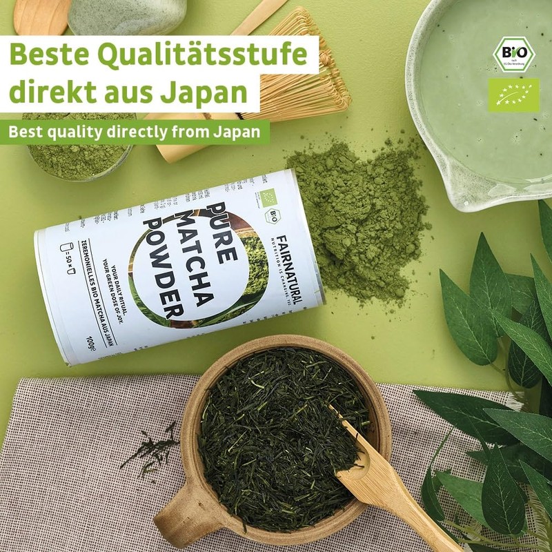 FAIRNATURAL Bio Matcha Pulver aus Japan in Zeremonieller Qualität für Matcha Latte, Premium Qualität und Vegan 100g oder 40g (100g - 50 Portionen)