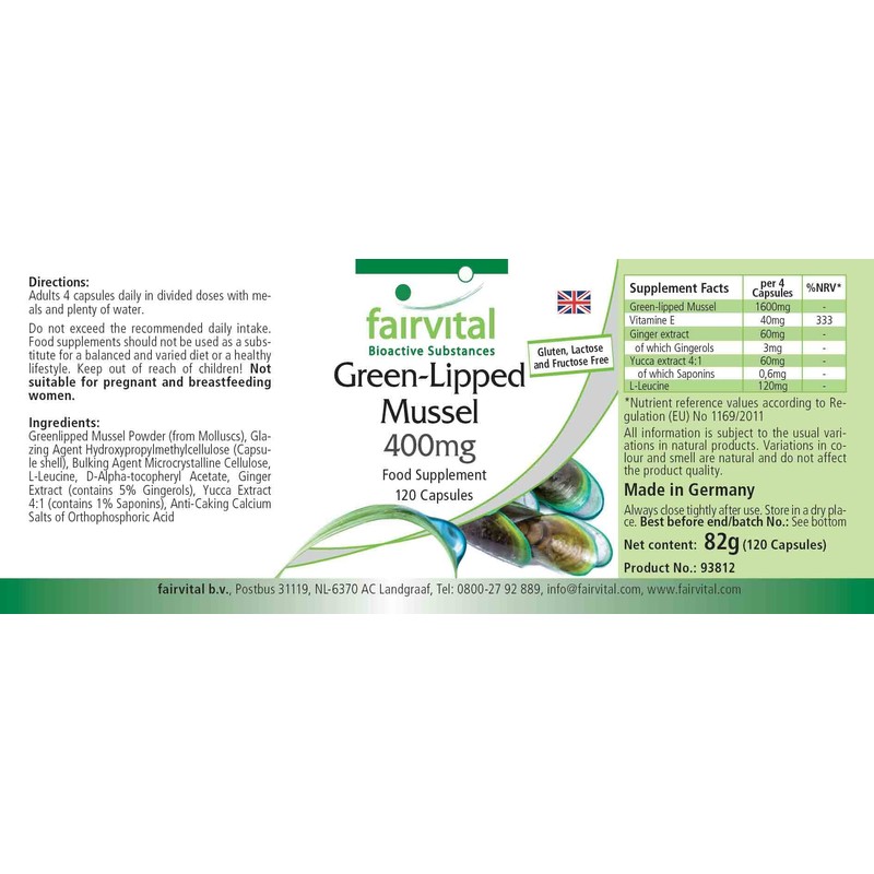 - ✔ fairvital German quality: daily dose: 4 capsules per day contain 40mg vitamin E, 1600mg green-lipped mussel extract, 60mg ginger extract, of which 3mg gingerols, 60mg yucca extract (3:1), of which 6mg saponins. High dose. Excellent value for money!