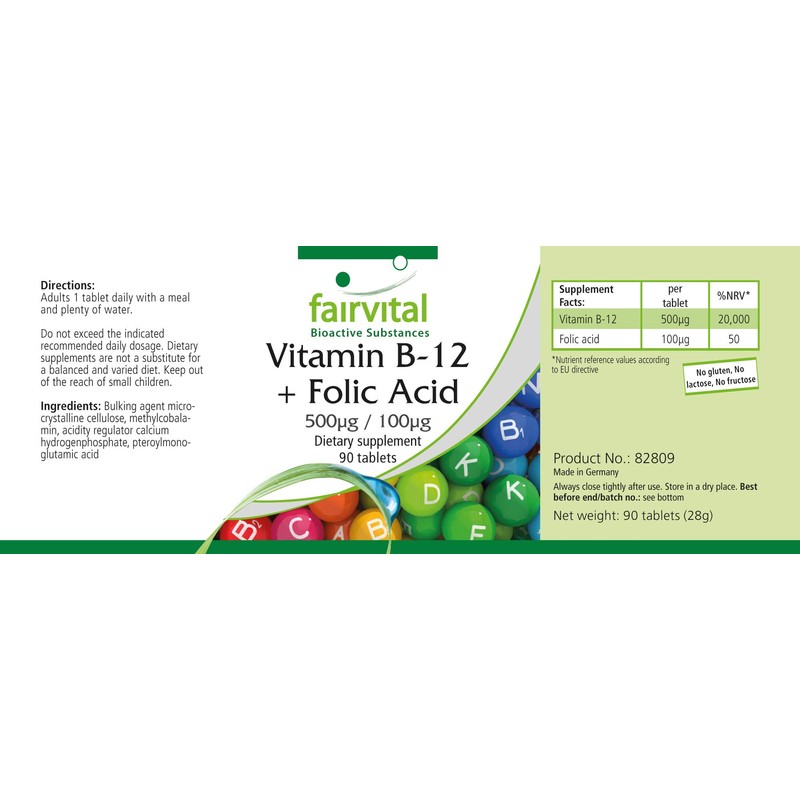 - ✔ fairvital German quality: daily dose: 1 tablet per day contains 500 μg vitamin B12 and 100 μg folic acid. High dose. Excellent value for money! Vitamin B9 and vitamin B12 contribute to normal homocysteine metabolism, normal blood formation and normal functioning of the immune system.