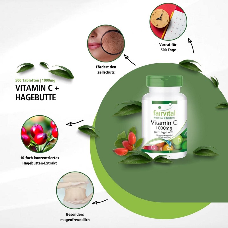 - ✔ fairvital German quality: daily dose: 1 tablet per day contains 1000 mg vitamin C and 100 mg rose hip extract 10:1, equivalent to 1000 mg rose hip. High dose. Excellent value for money! Vitamin C contributes to normal collagen formation, normal functioning of the immune system, normal mental function and to the reduction of fatigue and fatigue.