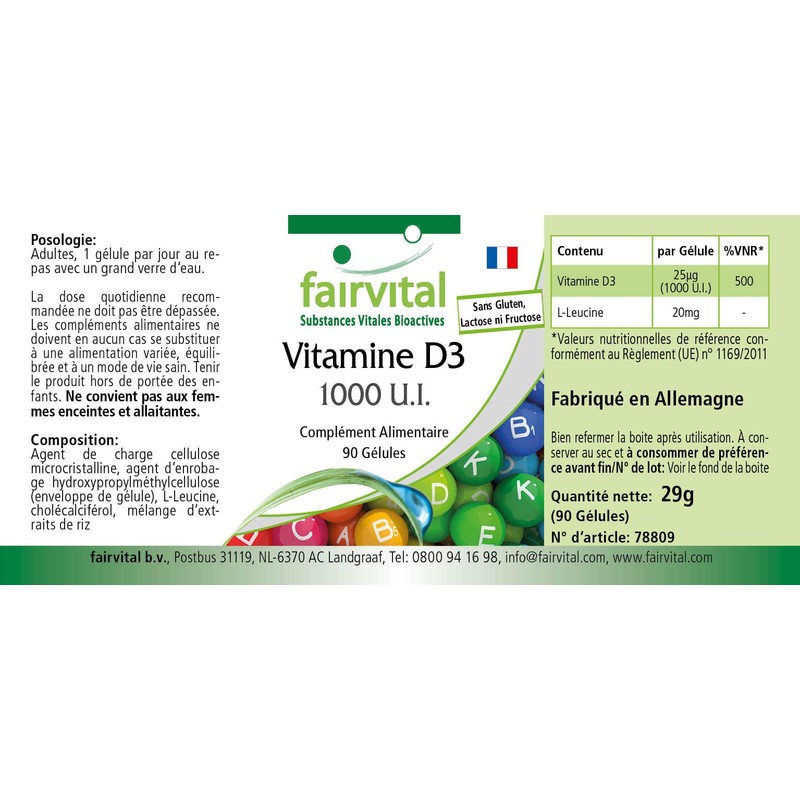 - ✔ fairvital German quality: daily dose: 1 capsule per day contains 25μg (1000 IU). Vitamin D3 High dose. Excellent value for money! Vitamin D contributes to the maintenance of normal bones and teeth as well as normal muscle function, normal blood calcium levels and normal functioning of the immune system.