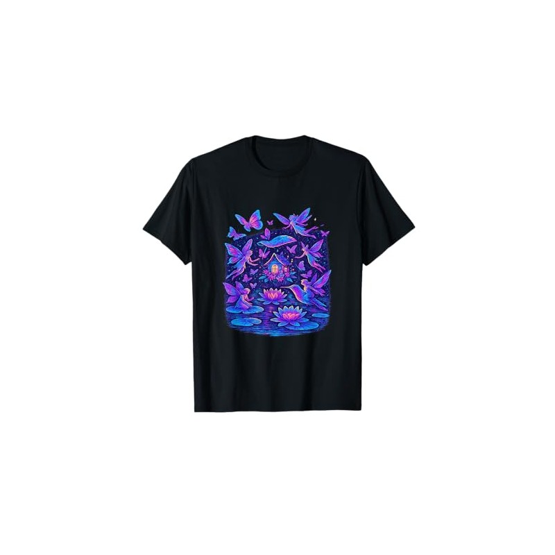 - Whimsical fairy scene glowing with vibrant colors-featuring fluttering fairies, butterflies, a cute forest cottage, and water lilies under a starlit sky. Perfect for fans of fantasy, fairycore, and magical worlds.