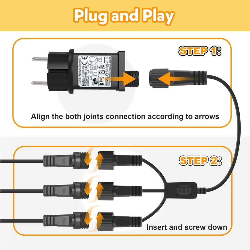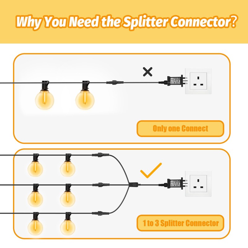- [Quickly solves connection problems] Say goodbye to cumbersome sockets and plugs. Our 3-in-1 Y-shape string lights splitter cable is so cleverly designed that you can connect three fairy lights to one socket at the same time and enjoy the comfort! Whether for indoor decorations or outdoor parties, you can easily create fantastic lighting effects.
