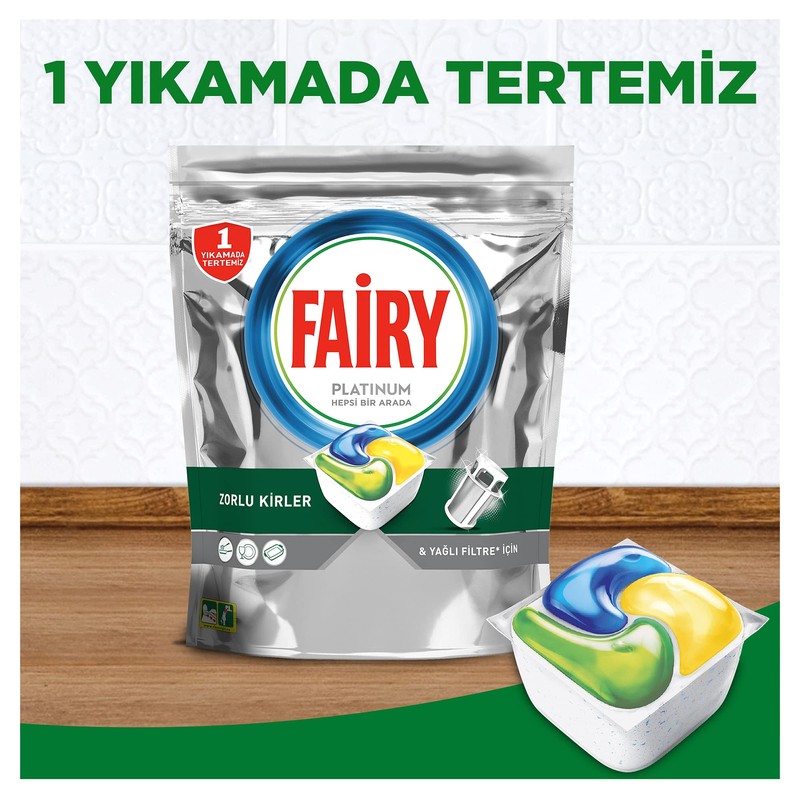 - Fairy Platinum tabletler zorlu yemek kirlerinde ilk yıkamada bile etkili