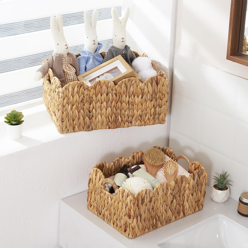 FairyHaus Wicker Basket 2Pack, Handwoven Scalloped Wicker Storage Basket with Handles, Natural Water Hyacinth Wicker Bakests for Storage, Large and Small Rectangle Basket, 15 x 11 x 7" & 13 x 9 x 6.5"