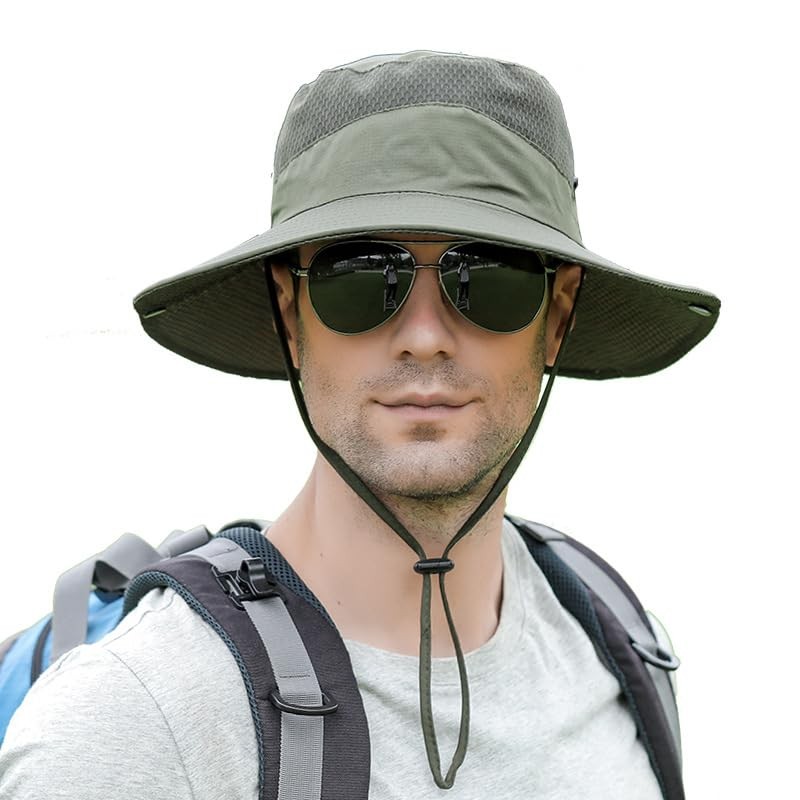- 4. Ultimate sun and rain protection: UPF 50+ men's sun hat blocks most of harmful UV rays, 3.35 inches (8.5 cm) large wrap-around brim, wide-brimmed sun protection sun hat provides the best sun protection for face, eyes, ears and neck. This fishing hat makes it easy to enjoy the great outdoors without worrying about tanning or sunburn. The outdoor brim and top part of the hat are made of waterproof polyester, so you can be outside even in light rain.