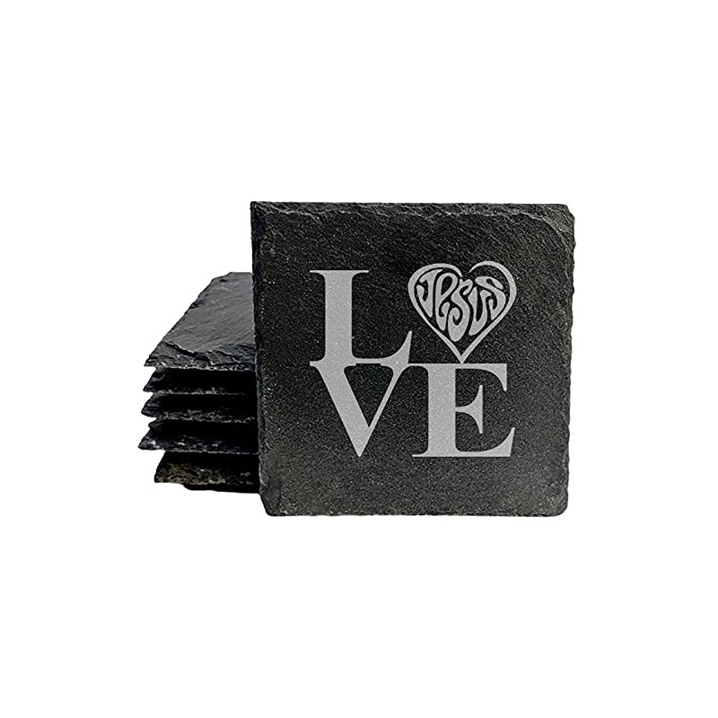 Handcrafted from natural gray slate, each coaster boasts a unique, chipped edge that adds a touch of rustic charm to your kitchen counter, coffee table, entryway, or any space where you want to keep your faith close. The creative design features the word "LOVE" with a heart replacing the letter "O," and the name "Jesus" inscribed within, creating a permanent and conversation-starting addition to your Christian home decor.**