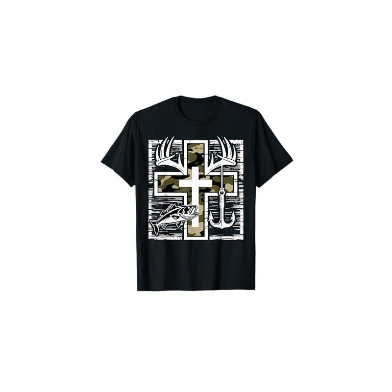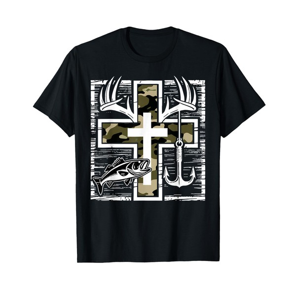Faith Fishing Hunting Camo Cross with Hook Bass Christian T-Shirt