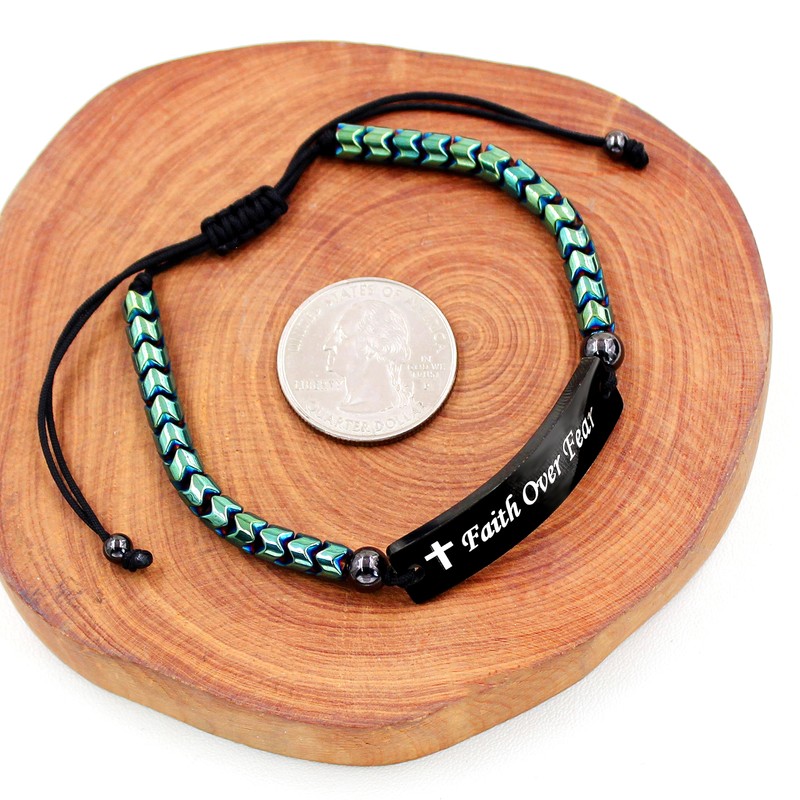 - ♥ Style: Gear-shaped hematite bracelet braided adjustable engraved motivatioanl words Faith Over Fear and Cross Symbol.